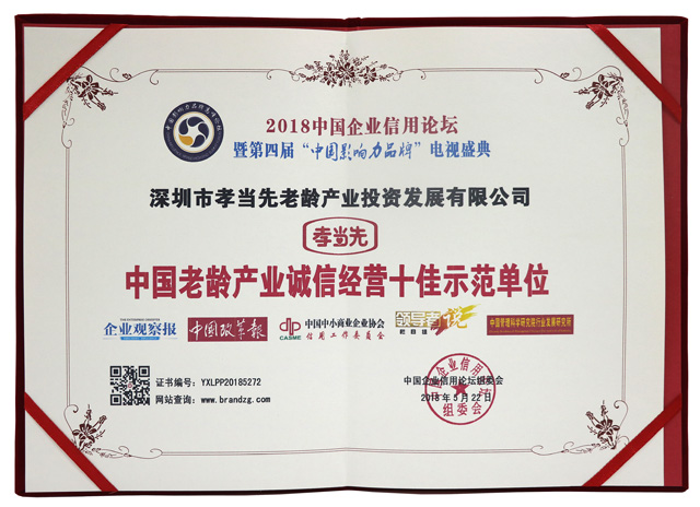 誠信和孝道都是中華民族優(yōu)秀的傳統(tǒng)文化,孝當先集團始終堅守誠信,弘揚孝道,不忘初心,深耕老齡產業(yè),助力我國老齡產業(yè)健康蓬勃發(fā)展,為中華民族實現(xiàn)“老有所養(yǎng)、老有所依、老有所樂、老有所為”的目標而努力奮斗。