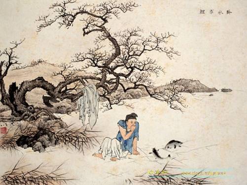 王祥,瑯琊人,生母早喪,繼母朱氏多次在他父親面前說(shuō)他的壞話(huà),使他失去父愛(ài)。父母患病,他衣不解帶侍候,繼母想吃活鯉魚(yú),適值天寒地凍,他解開(kāi)衣服臥在冰上,冰忽然自行融化,躍出兩條鯉魚(yú)。繼母食后,果然病愈。王祥隱居二十余年,后從溫縣縣令做到大司農(nóng)、司空、太尉。