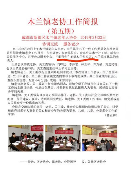2019年2月22日上午,四川新都木蘭鎮(zhèn)老年人協(xié)會(huì)、關(guān)心下一代工作委員會(huì)與社會(huì)公益組織工作協(xié)調(diào)會(huì)順利召開。會(huì)議由鎮(zhèn)老協(xié)秘書長(zhǎng)、關(guān)工委副主任林正和主持,孝當(dāng)先新都木蘭羊奶專賣店受邀出席。