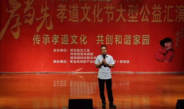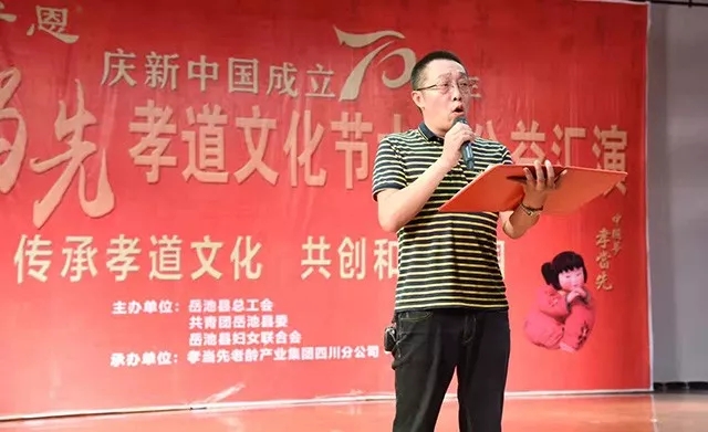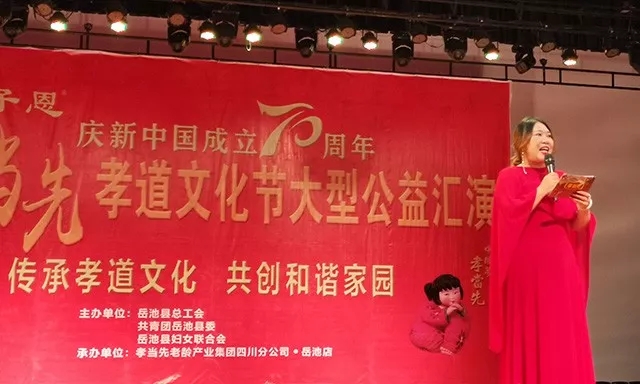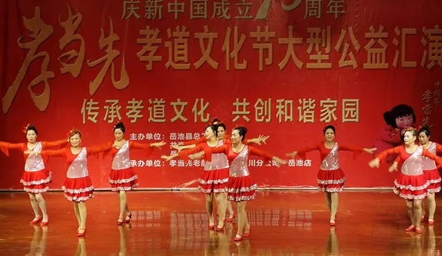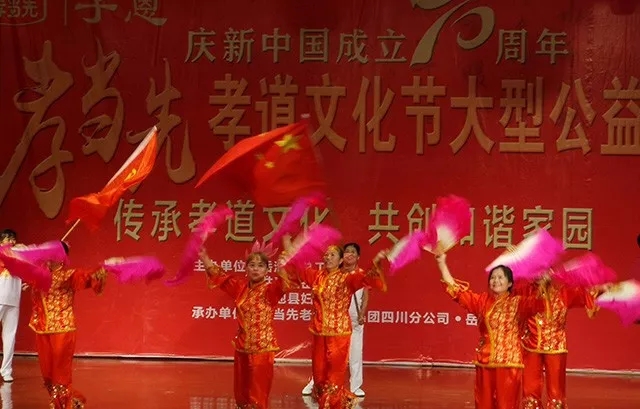 9月22日,岳池縣總工會(huì)、共青團(tuán)岳池縣委、岳池縣婦女聯(lián)合會(huì)主辦,孝當(dāng)先老齡產(chǎn)業(yè)集團(tuán)四川分公司·岳池店承辦的“慶新中國(guó)成立70周年”孝當(dāng)先孝道文化節(jié)大型公益匯演岳池分會(huì)場(chǎng)圓滿成功。來(lái)自社區(qū)12支表演團(tuán)隊(duì)200多人載歌載舞,表達(dá)迎接祖國(guó)70華誕的喜悅心情,共同弘揚(yáng)中華孝道文化優(yōu)良傳統(tǒng)美德。精彩的節(jié)目表演,吸引600多名觀眾觀看。