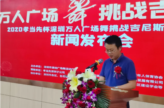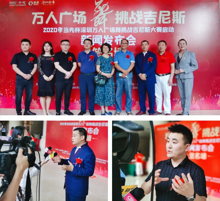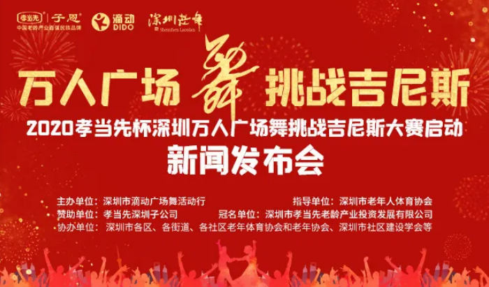 隨著各屆大咖嘉賓在簽到墻處打卡合影,接受來自深圳電視臺的采訪,并由深圳老年人體育協(xié)會、深圳老年協(xié)會、滴動科技及孝當(dāng)先等多位領(lǐng)導(dǎo)共同主持的啟動儀式下,本次由深圳市老年人體育協(xié)會全程指導(dǎo),深圳市滴動廣場舞活動行主辦,深圳市孝當(dāng)先老齡產(chǎn)業(yè)投資發(fā)展有限公司(以下簡稱為“孝當(dāng)先”)冠名,孝當(dāng)先深圳子公司贊助,并由深圳市各區(qū)、各街道、各社區(qū)老年人體育協(xié)會和老年協(xié)會,深圳市社區(qū)建設(shè)學(xué)會等單位共同協(xié)辦的“2020孝當(dāng)先杯深圳萬人廣場舞挑戰(zhàn)吉尼斯大賽”暨新聞發(fā)布會,正式隆重揭幕!