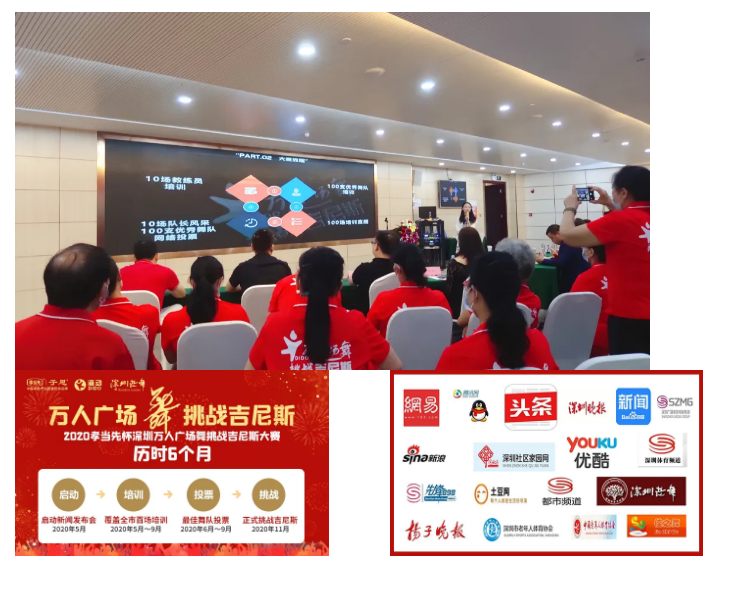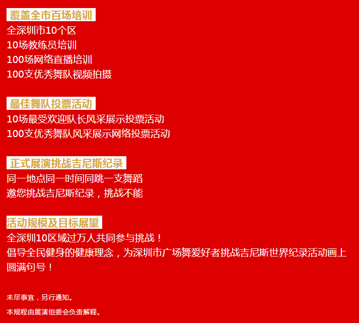 為確?;顒尤缙陧樌e辦并具影響力,萬人展演大賽負責(zé)人李麗女士稱,在新聞發(fā)布會啟動儀式過后,挑戰(zhàn)吉尼斯記錄展演日之前,這場將為期半年的萬人展演活動,將通過培訓(xùn) — 投票 — 挑戰(zhàn),由2020年6月15日起覆蓋全深圳10個區(qū)域,貫穿700+個社區(qū),過萬人共同參與,更會在過程中舉行逾百場的公益培訓(xùn)、最佳展示投票、進行優(yōu)秀舞蹈視頻拍攝等系列相關(guān)活動,直至2020年12月12日,正式迎來萬眾矚目 同一時間,同一地點 完成萬人挑戰(zhàn)吉尼斯紀錄展演活動!