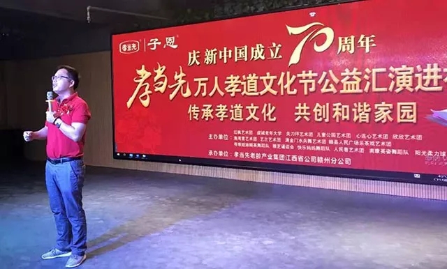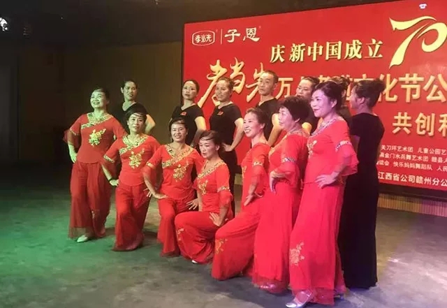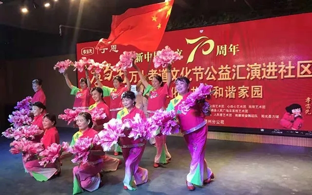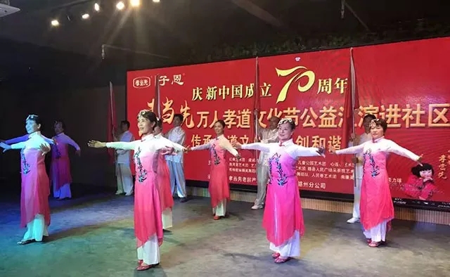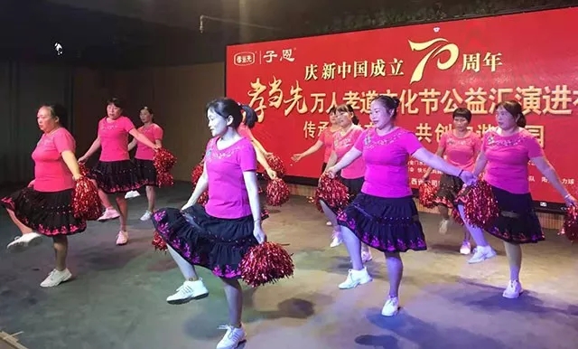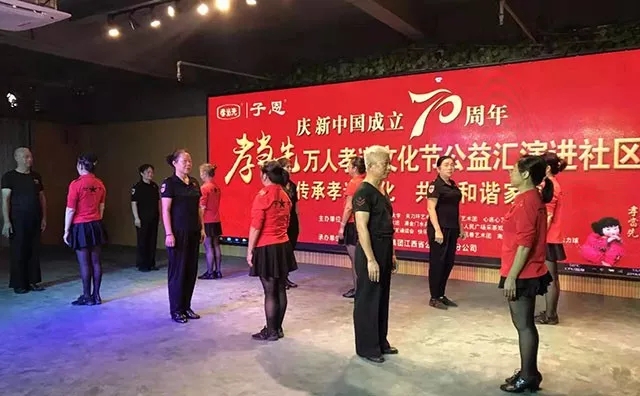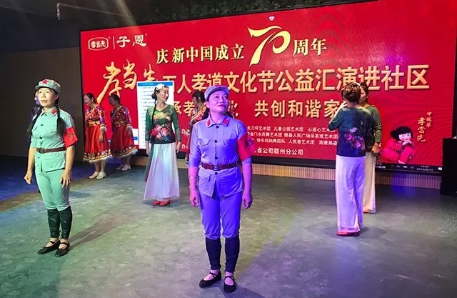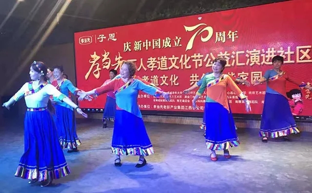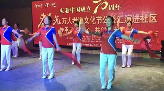 頌祖國(guó),傳孝恩。8月31日,紅楓藝術(shù)團(tuán)、虔誠(chéng)老年大學(xué)、贛州洋彩藝術(shù)中心、關(guān)刀坪藝術(shù)團(tuán)等單位主辦,孝當(dāng)先老齡產(chǎn)業(yè)集團(tuán)江西省公司贛州分公司協(xié)辦的“慶新中國(guó)成立70周年” 暨孝當(dāng)先萬(wàn)人孝道文化節(jié)公益匯演進(jìn)社區(qū)贛州二中店分會(huì)場(chǎng)成功舉辦。來(lái)自社區(qū)的18支表演團(tuán)隊(duì),用精彩的歌舞迎接祖國(guó)70華誕,弘揚(yáng)孝道文化,展現(xiàn)中老年人豐富多彩的晚年生活和獨(dú)特魅力。